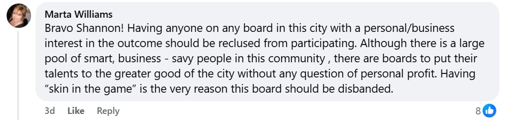 “Bravo Shannon! Having anyone on any board in this city with a personal/business interest in the outcome should be recused from participating,” resident Marta Williams wrote. GC Wire had previously reported RDA member Kenny Williams owns more than a half dozen bars within walking distance of the proposed hotel. “Although there is a large pool of smart, business – savvy people in this community, there are boards to put their talents to the greater good of the city without any question of personal profit,” Williams added.