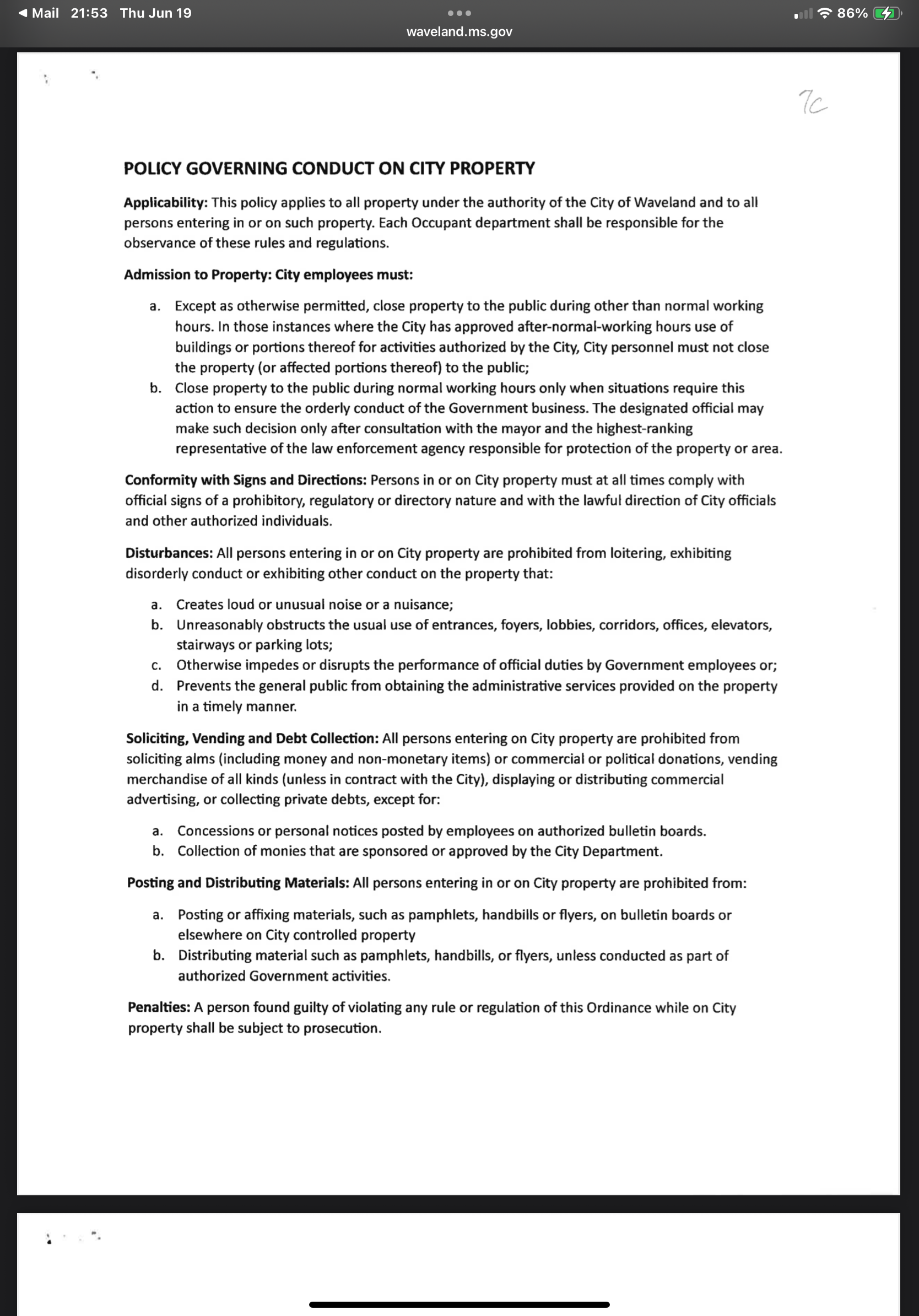The city’s new ordinance, titled “Policy Governing Conduct on City Property,” bans the posting or distribution of pamphlets, handbills, or fliers on any city-controlled property unless such activity is part of a “government-authorized” function. It also bars soliciting donations, even for political or charitable causes, and states that anyone who violates the policy “shall be subject to prosecution.”
