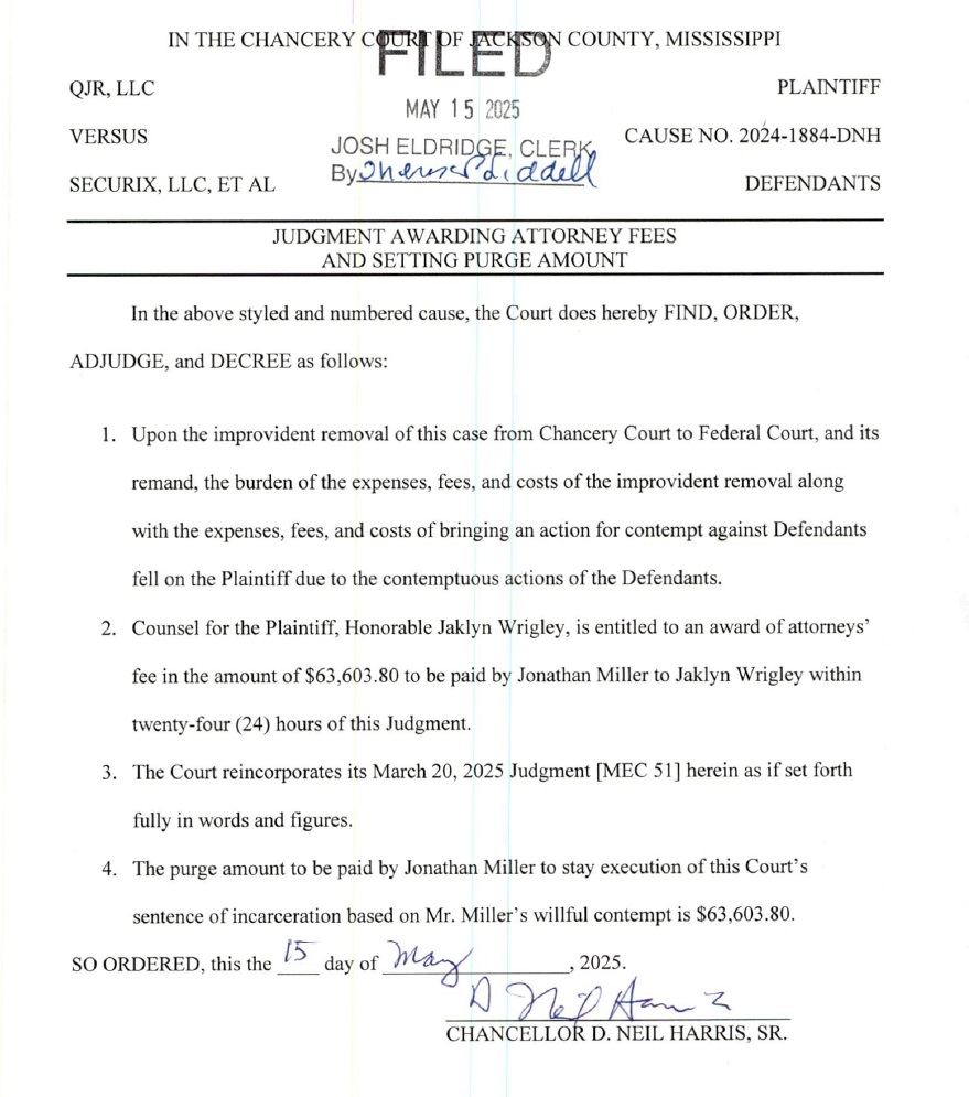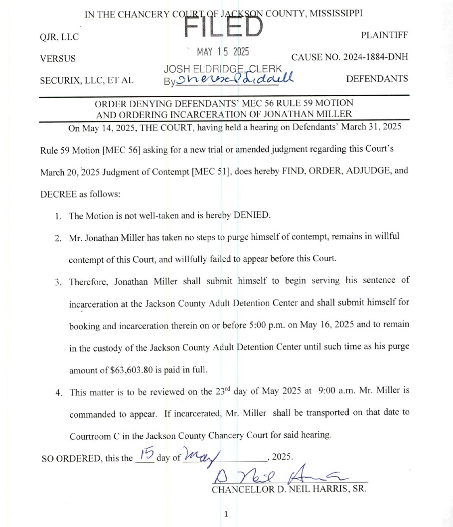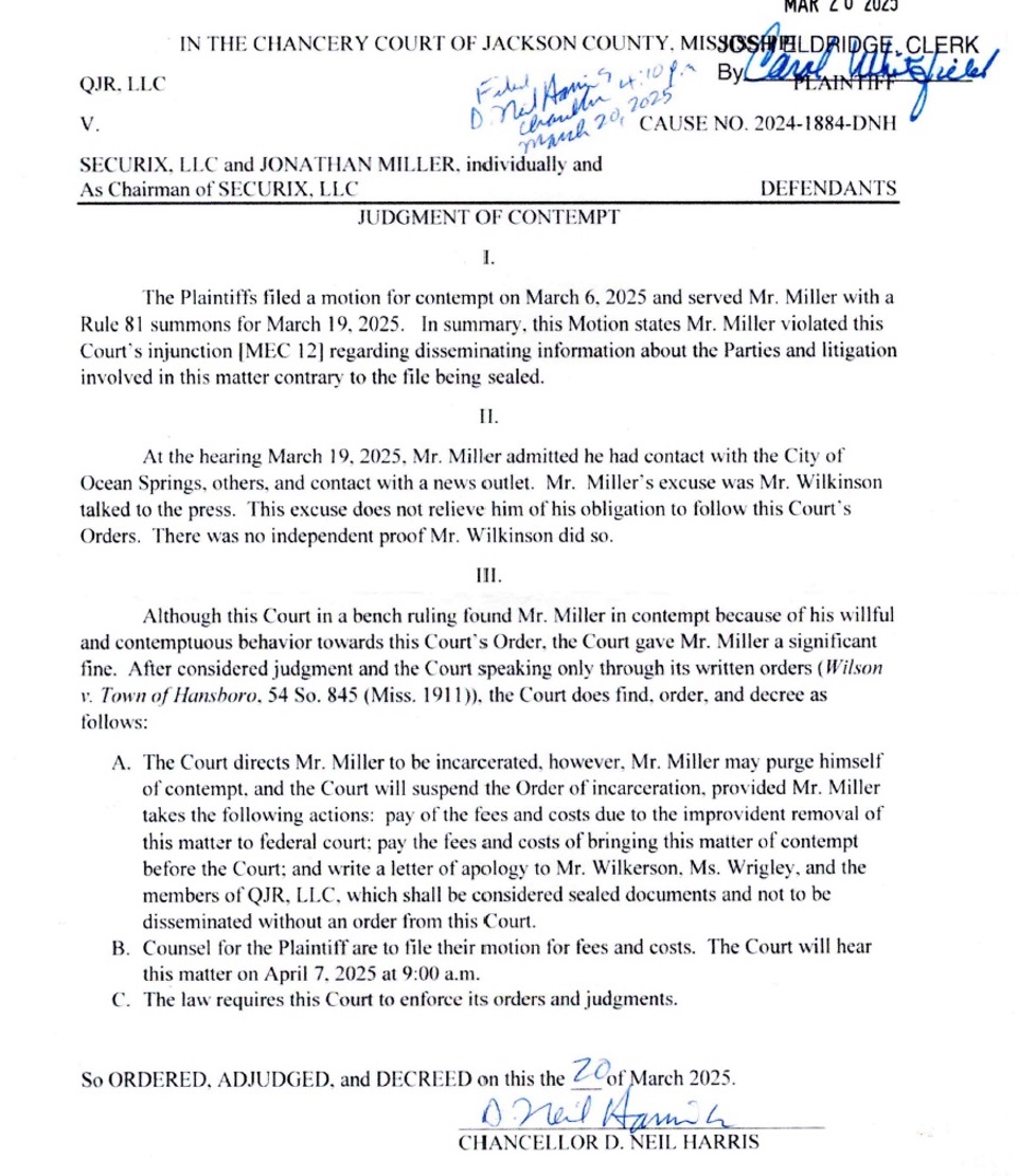 In that order, Judge Harris also found Miller in contempt of court for having emailed Ocean Springs Mayor Kenny Holloway in November and speaking to this reporter in December, even though the topic of both interactions was the Ocean Springs contract, which predated the existence of QJR and Securix Mississippi.