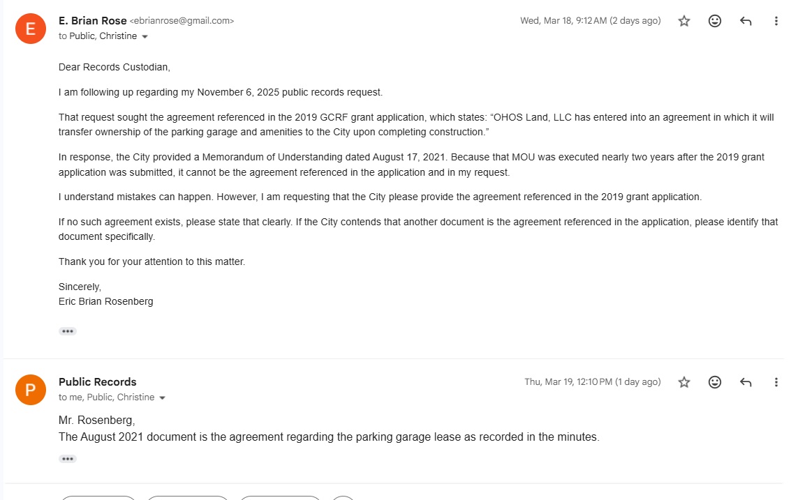 The Ownership Agreement: Both grant applications – one from 2019 and the other submitted in 2020 – contained a line stating OHOS had entered into a formal agreement to transfer ownership of the garage to the city. We requested that agreement. The city responded by telling us the agreement referenced in the 2019 and 2020 applications was the lease MOU. But that MOU did not exist until 2021, two years after a reference was made to an ownership agreement. Despite a follow-up email explaining the discrepancy, the city stuck to their original answer.