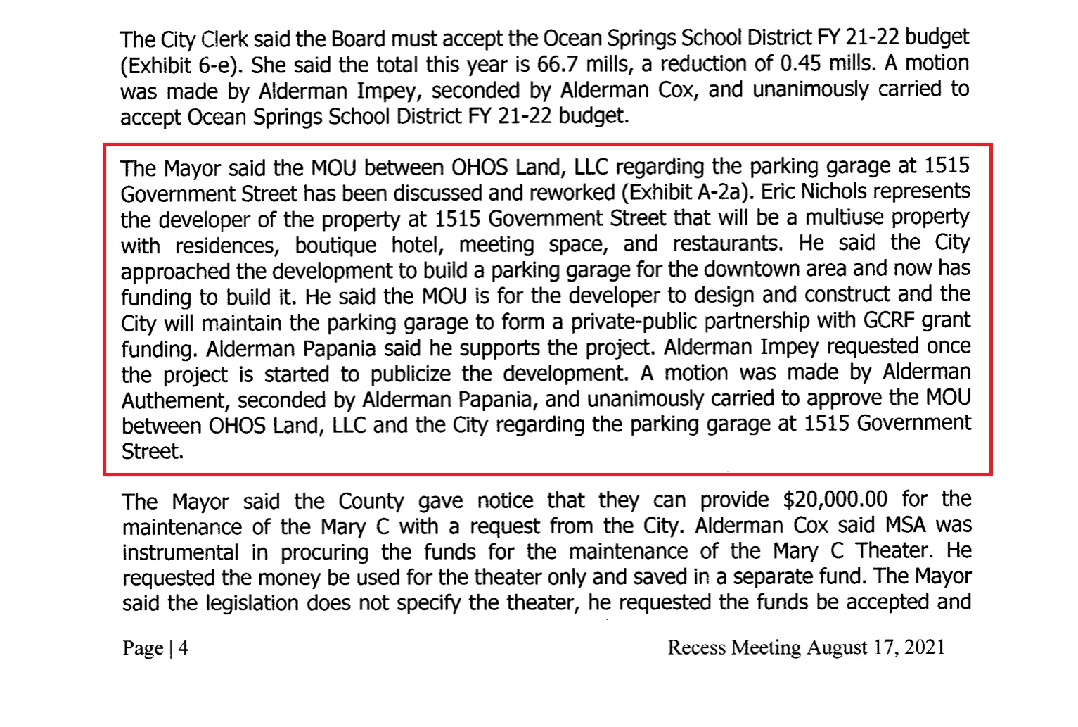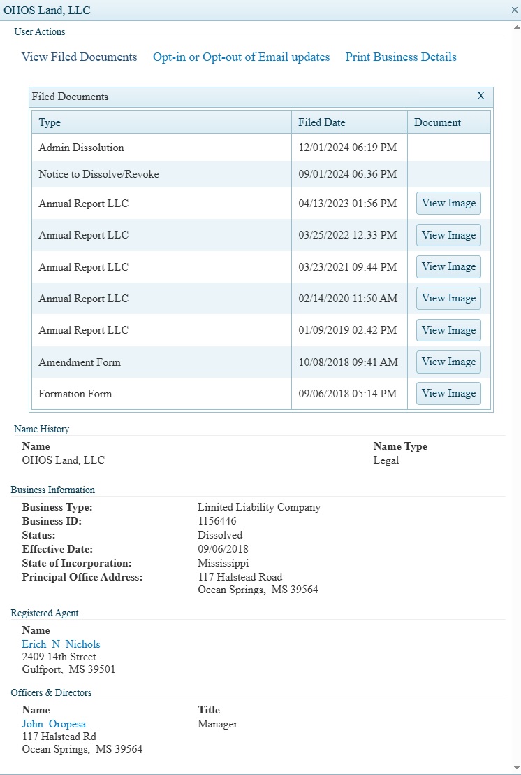 Adding to the confusion, the company Ocean Springs partnered with to get the grant — doesn’t exist anymore. The still effective MOU lists the City’s agreement is with OHOS Land LLC and OHOS Development LLC, however, only OHOS Land was on the grant application.